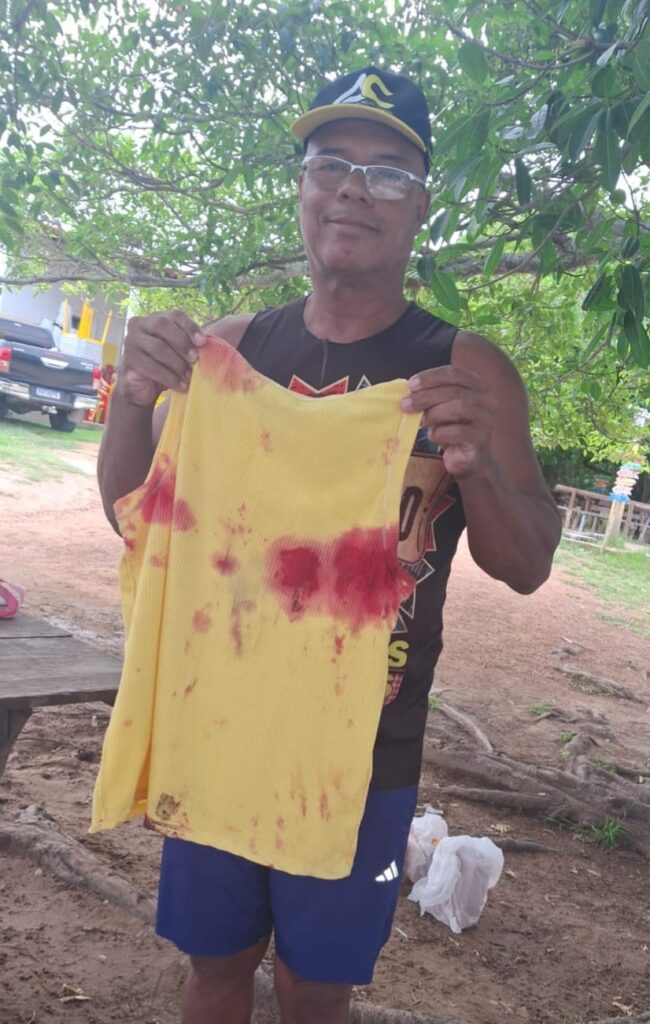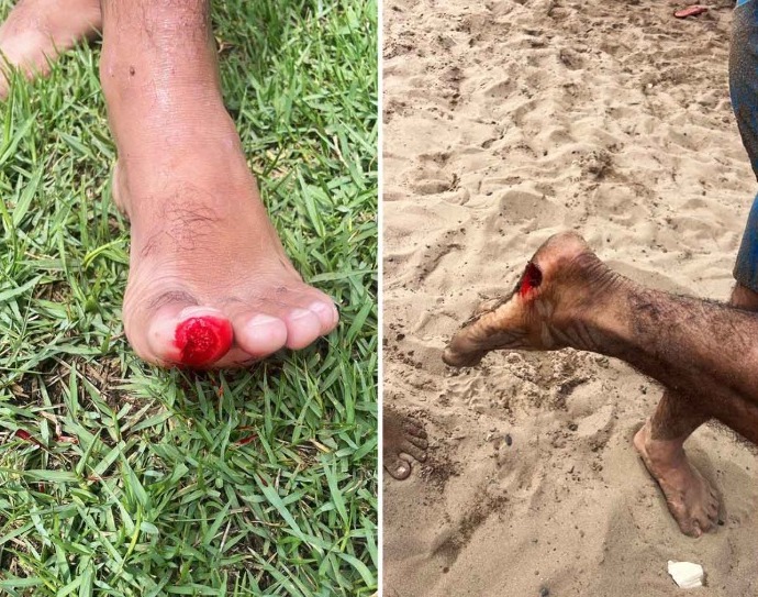 “A piranha deu uma brocada do lado do pé. A sorte foi que não pegou no dedo, porque ele estava enterrado na areia. Pegou na parte da carne, abriu um buraco e começou a sangrar muito”, contou.
