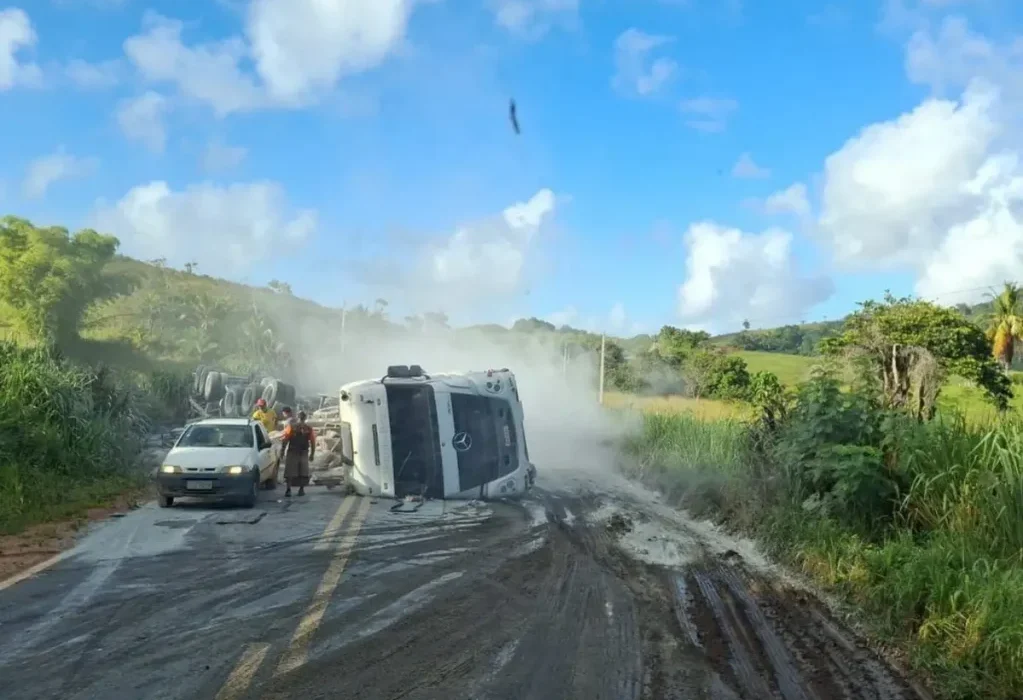 Uma carreta Mercedes Benz Actros 2018 branca, com licença do município de Mucuri/BA, que transportava uma carga de cimento, tombou no km 790 da BR-101, próximo ao distrito de Montinho, no município de Itabela, no extremo sul da Bahia.