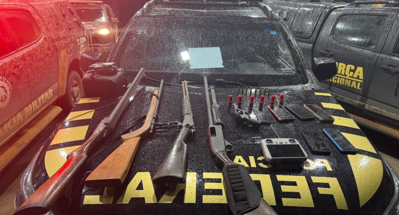 Durante a ação, foram apreendidas cinco armas de fogo e aparelhos celulares. Na área em conflito fundiário, ocupada por supostos indígenas, equipes das Polícias Militar, Civil e Federal localizaram duas espingardas calibre 12, um rifle calibre 38 e dois revólveres calibre 38. Os armamentos estavam enterrados em uma área de mata fechada, próxima ao local onde as vítimas foram atacadas. Informações que possam auxiliar as Forças Policiais na elucidação do caso podem ser repassadas por meio do telefone 181 (Disque Denúncia da SSP). O anonimato é garantido por lei.