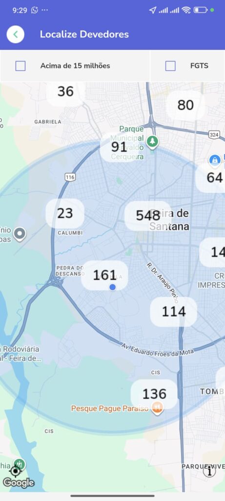 Quando abrimos o aplicativo direcionando para Feira de Santana, tivemos uma espanto: a quantidade de empresas em Feira que devem à União é imensa, muitas delas conhecidas do público feirense. A maioria dos devedores está localizado no Centro da cidade e a dívida total somada ultrapassa a casa do bilhão.