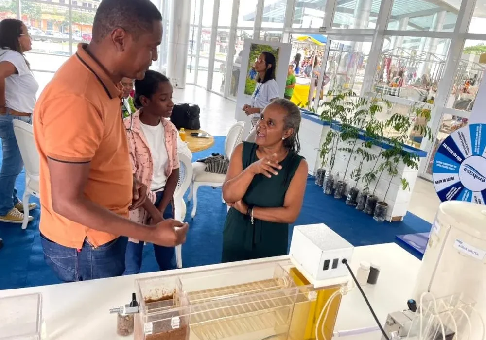 No estande da Embasa, os participantes têm a oportunidade de aprender sobre o tratamento da água e do esgoto, participar de jogos educativos e ainda receber mudas de plantas nativas, incentivando ações de reflorestamento e cuidado ambiental.