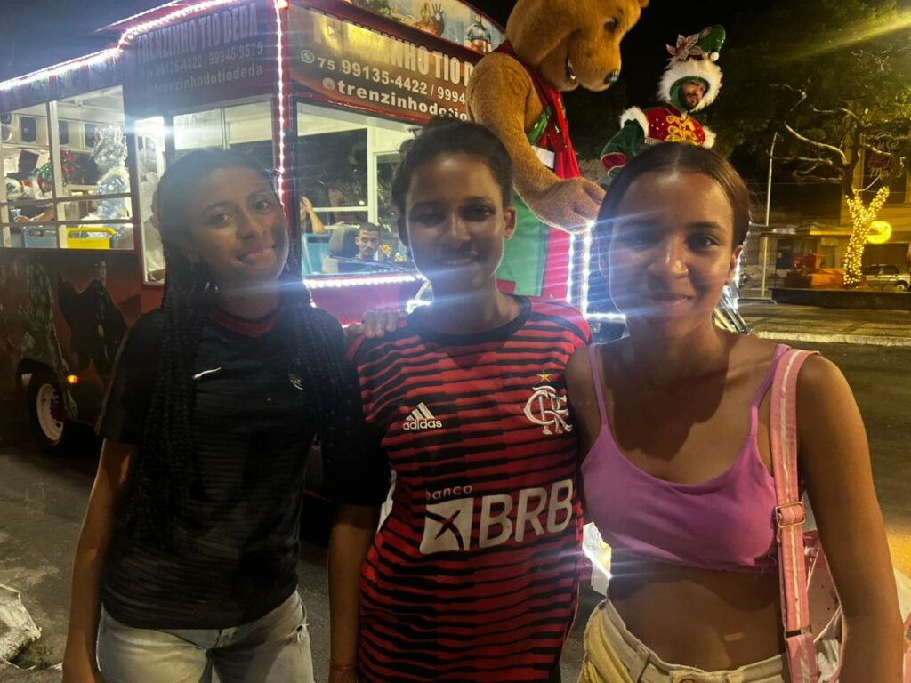 Durante o evento, moradores aproveitaram para avaliar a decoração. Três irmãs — Beatriz, Vitória e Larissa — comentaram a novidade. Beatriz, de 18 anos, achou “muito bonito”. Vitória, 19, destacou que gostaria que a iluminação fosse ornamentada antes: “Daria para aproveitar melhor, tirar mais fotos, trazer as crianças”. Larissa completou dizendo que achou tudo “impressionante” e pretende registrar muitas imagens nos próximos dias. As três confirmaram presença no Natal Encantado.