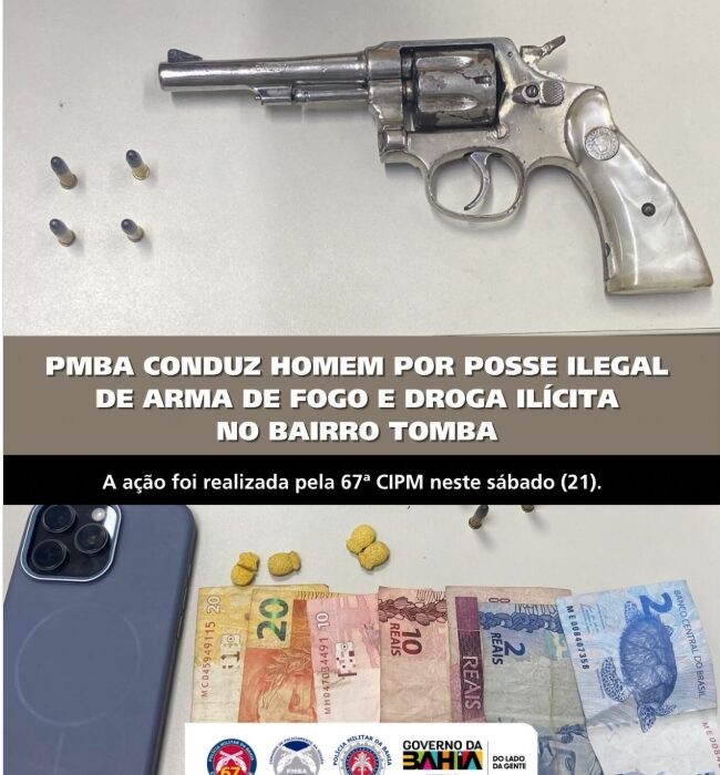 Na noite deste sábado (21), durante a Operação Extra Horam, policiais militares da 67ª CIPM conduziram um homem por posse ilegal de arma de fogo e droga na BA-502, no bairro Tomba, em Feira de Santana.