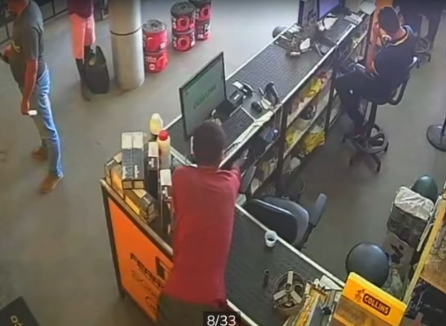 Um furto inusitado foi registrado em plena luz do dia na Avenida de Contorno, em Feira de Santana. As câmeras de segurança da loja JT Ferro e Aço flagraram o momento em que um homem, usando camisa vermelha, se aproveita de um descuido dos atendentes e furta um aparelho celular que estava na parte interna do balcão.