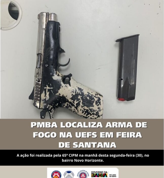 Na manhã desta segunda-feira (30), militares da 65ª CIPM (Companhia Independente de Polícia Militar) foram acionados via CICOM (Centro Integrado de Comunicação), após receberem a informação de que uma pistola calibre 380 foi encontrada no campus da UEFS (Universidade Estadual de Feira de Santana.