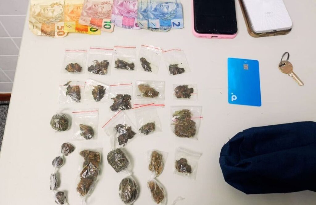 Ao chegarem ao local indicado, os militares encontraram os suspeitos e realizaram a abordagem. Durante a revista, foram apreendidas 26 porções de maconha, dois aparelhos celulares, R$ 89 em dinheiro e um cartão de crédito.