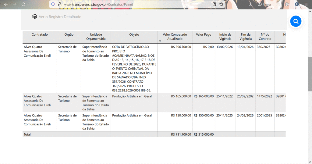 Segundo o Portal da Transparência, existem, 3 contratos celebrados com a Alves Quatro Comunicação, o primeiro, no valor de R$ 165 mil, que teve início em 25/11/2022 e encerrado no mesmo ano, para produção artística em geral, constando como pago; o segundo contrato, teve início em 25/11/2025 e se encerrará no próximo dia 24, com o valor de R$ 150 mil, que também já consta como pago, também para produção artística. A campanha de divulgação para a campanha de distribuição do preservativo no Carnaval é de R$ 396.700,00, teve início no dia 13/02 e estará vigente até o dia 13/04, sendo este o único que falta a ser pago.