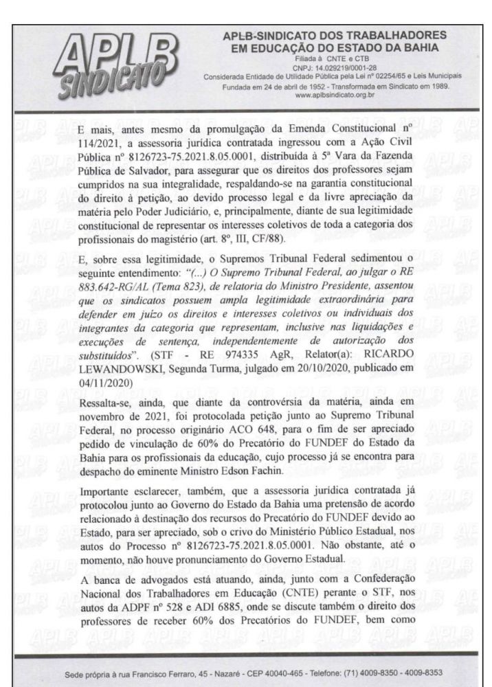 De acordo com Marinalva Nunes, presidente da Aceb, a APLB estaria induzindo profissionais a acreditarem que, para receber o valor do fundo destinado ao magistério - 60% dos precatórios -, seria necessário assinar procuração e contrato do sindicato.