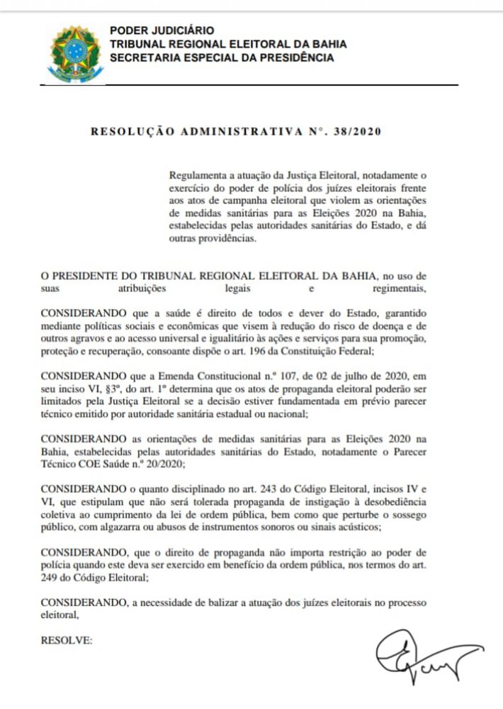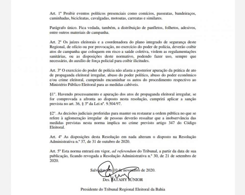 O Tribunal Regional Eleitoral da Bahia (TRE-BA) proibiu todos os eventos presenciais de campanha eleitoral, a cinco dias das eleições municipais, que ocorrem neste domingo (15). A decisão foi divulgada nesta terça-feira (10), por meio de uma resolução assinada pelo presidente da Corte eleitoral, desembargador Jatahy Júnior, e tem início a partir desta quarta-feira (11)