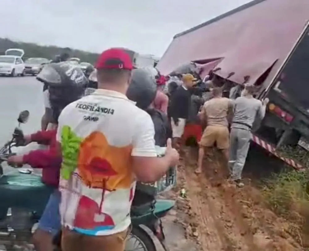 Acidente Carreta com carga de cerveja sai da pista e tem carga saqueada na BR-116, próximo a Serrinha