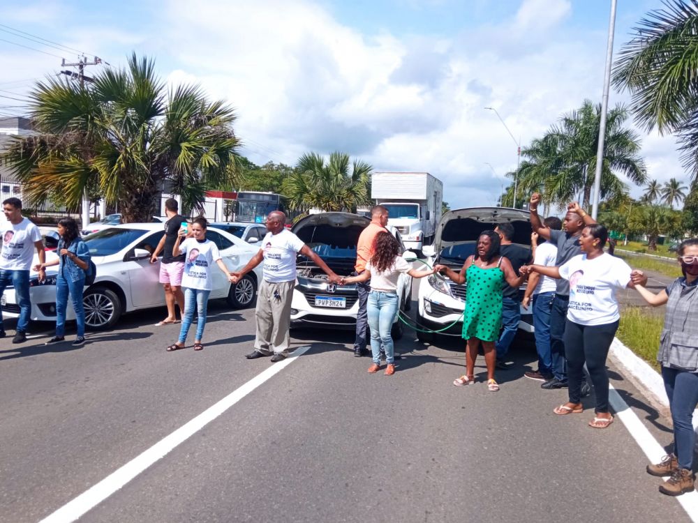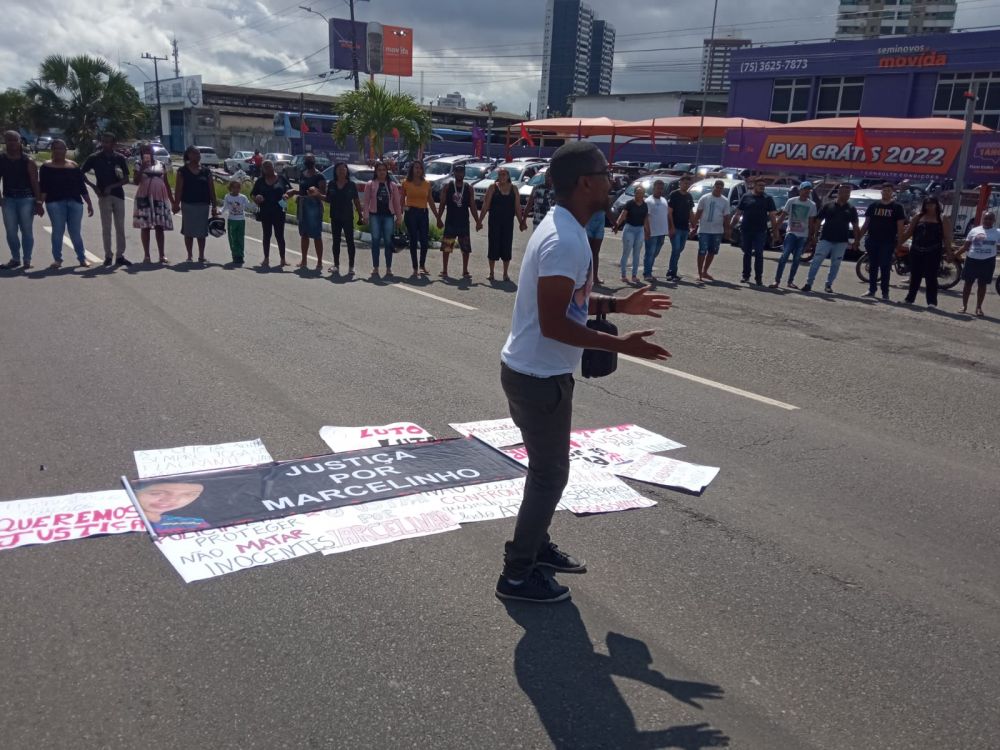 Familiares de Marcelo Felipe Guerra dos Santos Rocha,(Marcelinho) morto a tiros, em decorrência de intervenção policial após ter fugido de uma blitz da Polícia Militar em Feira de Santana, na noite de 1° de abril, realizaram manifestação com cartazes, orações e gritos por justiça, em frente ao Ministério Público da Bahia (MPBA), na Avenida Presidente Dutra nesta segunda-feira (23).