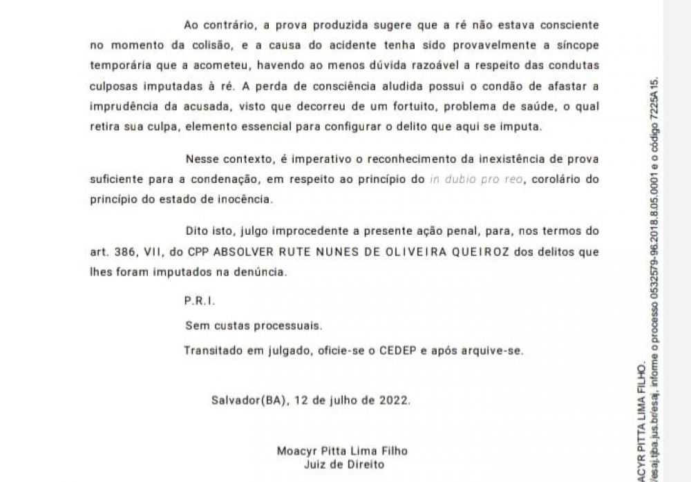 A decisão do magistrado, segundo a sentença, levou em consideração a “inexistência de provas suficientes para a condenação” da médica, uma vez que Rute Queiroz não estava consciente no momento do acidente.
