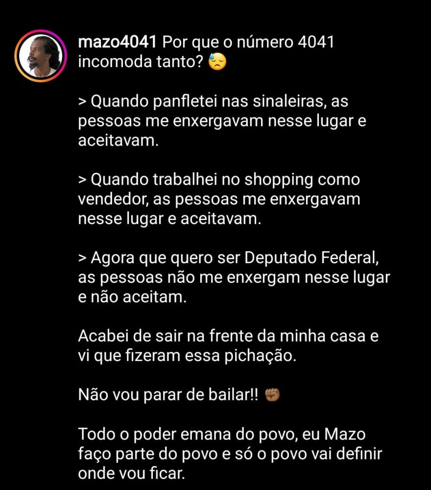 Mazo – Isso foi porque me coloquei como opção de voto, estou candidato a deputado federal pelo PSB, e pelo visto o número 4041 incomodou muita gente.