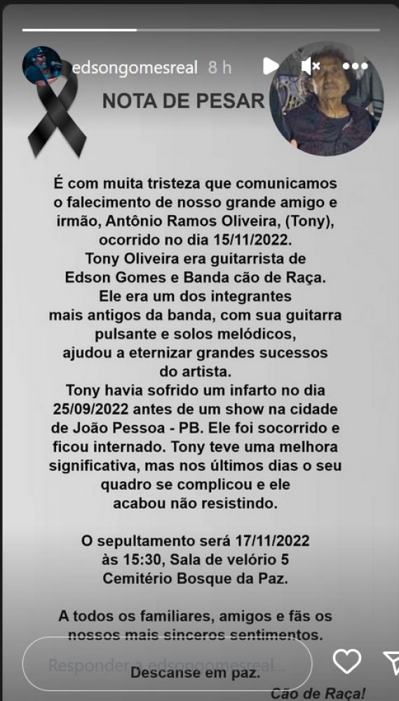 Faleceu nesta terça-feira (15), aos 64 anos, o guitarrista da Banda Cão de Raça, Antônio Ramos de Oliveira, mais conhecido como Tony Oliveira. O músico teve uma parada cardíaca no dia 25 de setembro durante um show da turnê Edson Gomes 50 anos e desde então vinha lutando pela vida, inclusive tendo uma melhora significativa de acordo com os médicos.