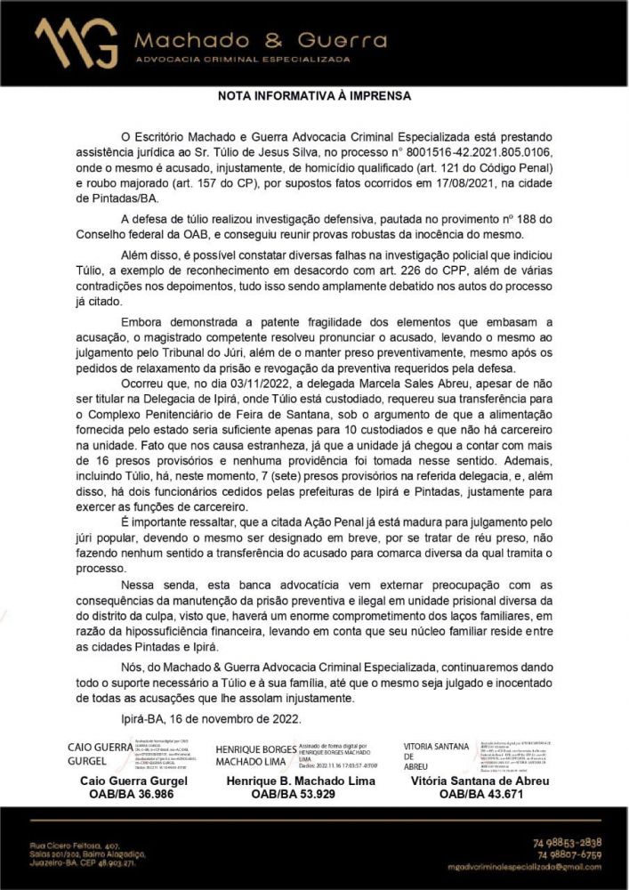 A defesa de Túlio emitiu nota à imprensa na quarta-feira (16), relatando que a prisão preventiva do jovem foi mantida apesar da fragilidade das provas e falhas na investigação policial.