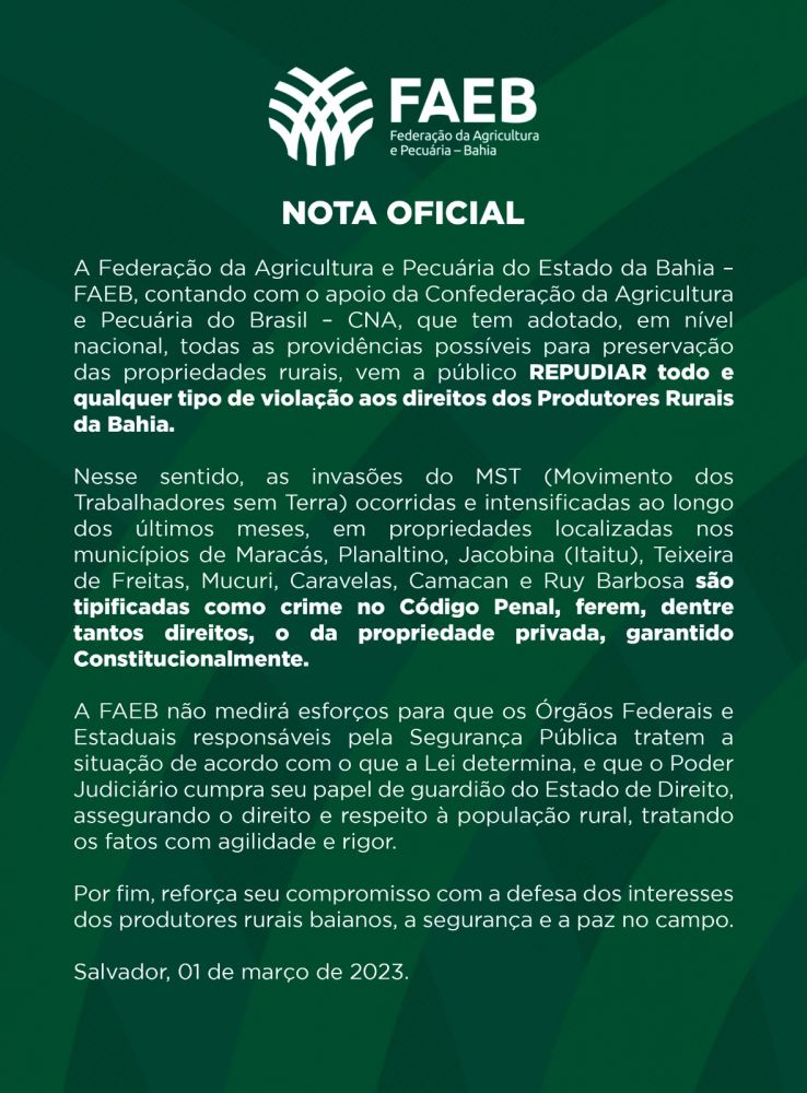 A FAEB (Federação de Agricultura e Pecuária da Bahia) enviou um ofício ao secretário de Segurança Pública da Bahia, Marcelo Werner, solicitando providências com relação ao ocorrido, e divulgou nota de apoio aos produtores rurais da região.