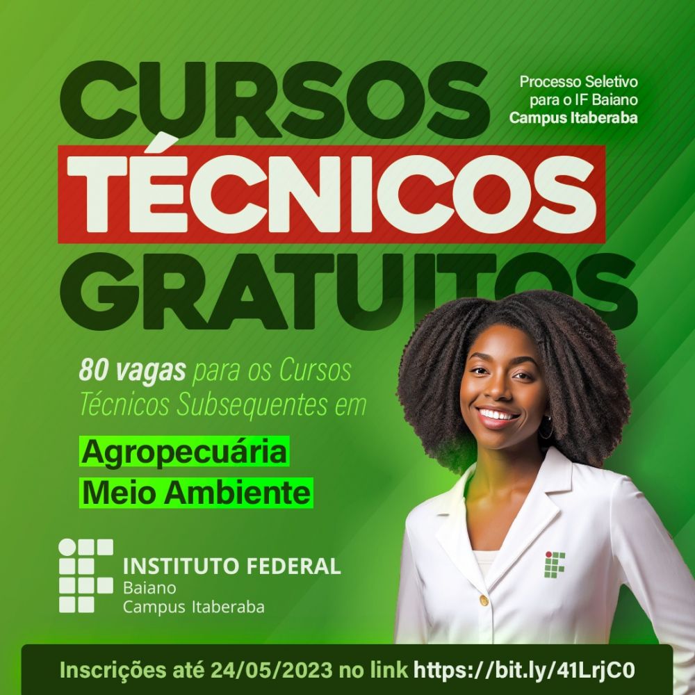 O Campus Itaberaba do Instituto Federal Baiano está com edital de seleção aberto com oferta de 40 vagas para o curso Técnico em Agropecuária e 40 vagas para o curso Técnico em Meio Ambiente, na modalidade Subsequente ao Ensino Médio. As inscrições são gratuitas e podem ser realizadas no período de 24 de abril a 24 de maio. Para concorrer às vagas, é preciso preencher o formulário digital disponível na página do certame e enviar a documentação exigida pelo edital.