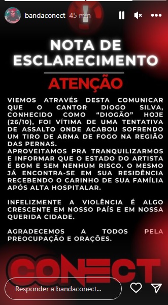 “Viemos através desta comunicar que o cantor Diogo Silva, conhecido como "Diogão" da Banda Conect, hoje (26/10), foi vítima de uma tentativa de assalto onde acabou sofrendo um tiro de arma de fogo na região das pernas. Aproveitamos pra tranquilizarmos e informar que o estado do artista é bom e sem nenhum risco. O mesmo já se encontra em sua residência recebendo o carinho de sua família após alta hospitalar. Infelizmente a violência e algo crescente em nosso país e em nossa querida cidade. Agradecemos a todos a preocupação e orações”, diz a nota.