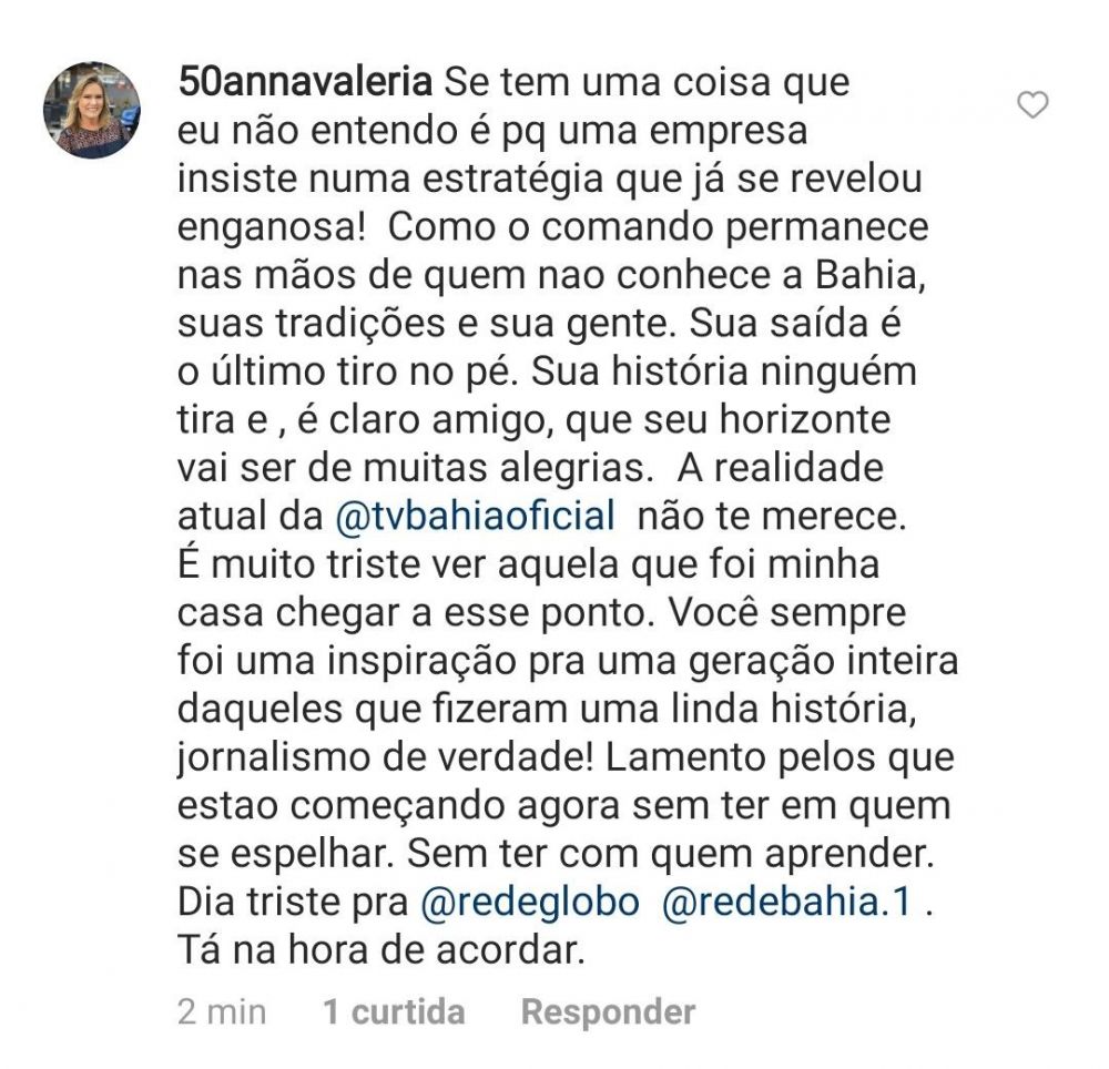 “A realidade atual da TV Bahia não te merece. É muito triste ver aquela que foi minha casa chegar a esse ponto. Você sempre foi uma inspiração para uma geração inteira daqueles que fizeram uma linda história, jornalismo de verdade. Lamento pelos que estão começando agora sem ter em quem se espelhar. Sem ter com quem aprender. Dia triste para a Rede Globo e a Rede Bahia. Tá na hora de acordar”, completou a jornalista, que foi desligada da emissora em 2019.