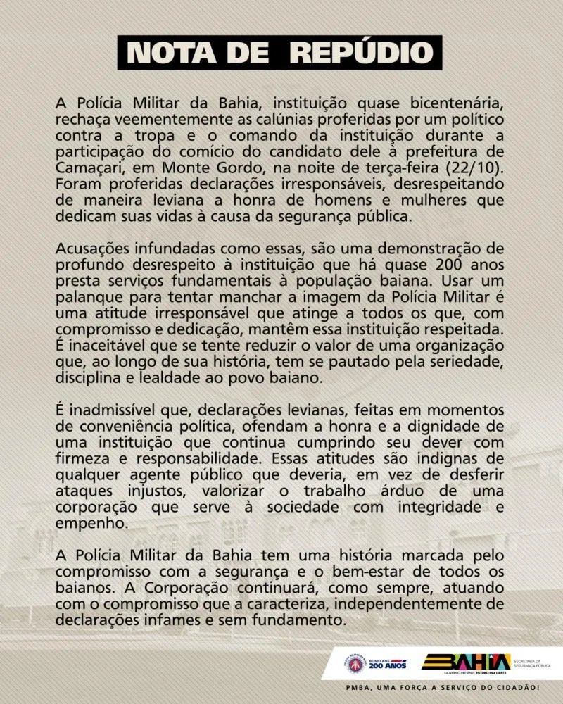 Em comunicado, o Comando Geral da PM-BA reafirmou o compromisso da corporação com a segurança e o bem-estar de todos os baianos, atuando com integridade e seriedade, independentemente de declarações infames e sem fundamento.
