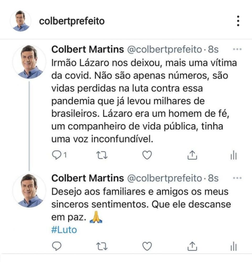 "Irmão Lázaro nos deixou, mais uma vítima da Covid. Não são apenas números, são vidas perdidas na luta contra essa pandemia que já levou milhares de brasileiros. Lázaro era um homem de fé, um companheiro de vida pública, tinha uma voz inconfundível. Desejo aos familiares e amigos os meus sinceros sentimentos. Que ele descanse em paz."