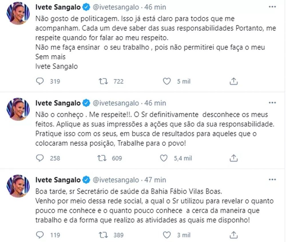 “@ivetesangalo vc deveria ser mais envolvida em questões sociais. O Brasil está no caminho do colapso na saúde. O que vc fez para ajudar a evitar?”, questionou o secretário de Saúde.