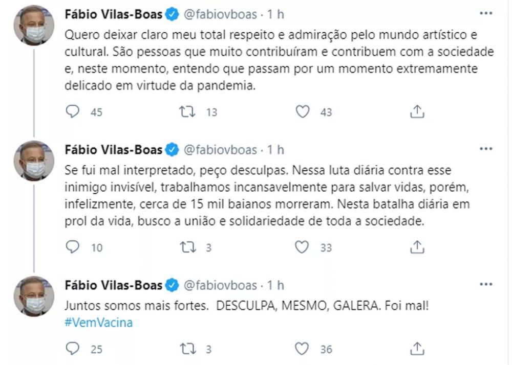 "Se fui mal interpretado, peço desculpas. Nessa luta diária contra esse inimigo invisível, trabalhamos incansavelmente para salvar vidas, porém, infelizmente, cerca de 15 mil baianos morreram. Nesta batalha diária em prol da vida, busco a união e solidariedade de toda a sociedade".