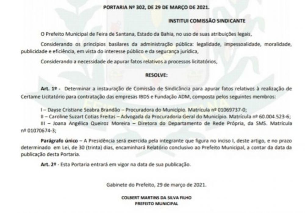 O prefeito Colbert Martins (MDB) determinou, através de sindicância, a apuração de fatos relativos a processos licitatórios da Prefeitura de Feira de Santana envolvendo a Fundação ADM e o Instituto Baiano para o Desenvolvimento da Saúde (IBDS). Portaria nesse sentido (nº 302) foi publicada na edição de terça-feira, 30.