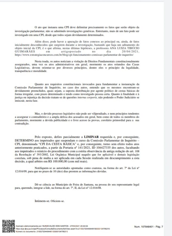 O juiz Nunisvaldo dos Santos, da 2ª Vara da Fazenda Pública de Feira de Santana, interpretou que a CPI feriu a constituição, segundo defesa do advogado Guga Leal. “impetramos um mandado de segurança, com o intuito de suspender a CPI, por motivos diversos. Um dos principais motivos, foi a falta da proporcionalidade das pessoas. O artigo ferido é a portaria 141/2021 que instituiu a CPI,a ser publicada, com o artigo 51. O artigo 108 dizia que, formada a CPI, sorteia-se 3 membros e a mesa indica dois suplentes. Depois do “jogo” da rolando, a mesa modificou o artigo, tirando a parte do sorteio, e o presidente passa a indicar os membros. Olha que perigo!”, relata.