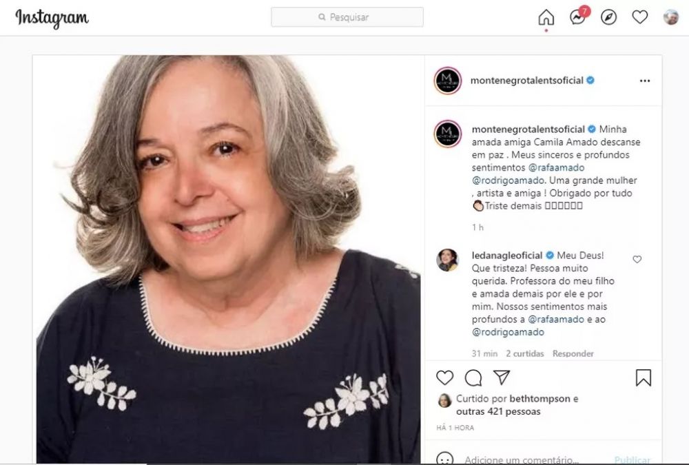 A agência de talentos Montenegro Talents, que assessorava a carreira de Camilla Amado, anunciou a morte da atriz por meio de sua página oficial no Instagram. "Uma grande mulher, artista e amiga", enfatizou a publicação.