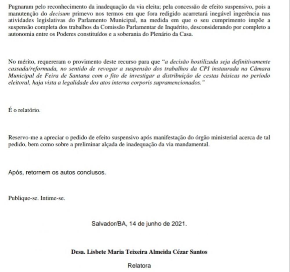 O site Olá Bahia teve acesso com exclusividade ao despacho da magistrada. Nele, a desembargadora Lisbete Teixeira espera que o MP se manifesta antes da decisão.