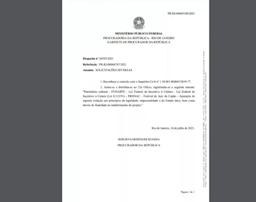 O parecer, no qual o G1 teve acesso, é datado de 25 de junho de 2021 e assinado pelo então coordenador do Programa Nacional de Apoio à Cultura da Funarte, Ronaldo Gomes. Ele foi exonerado do cargo no dia 1° de julho.